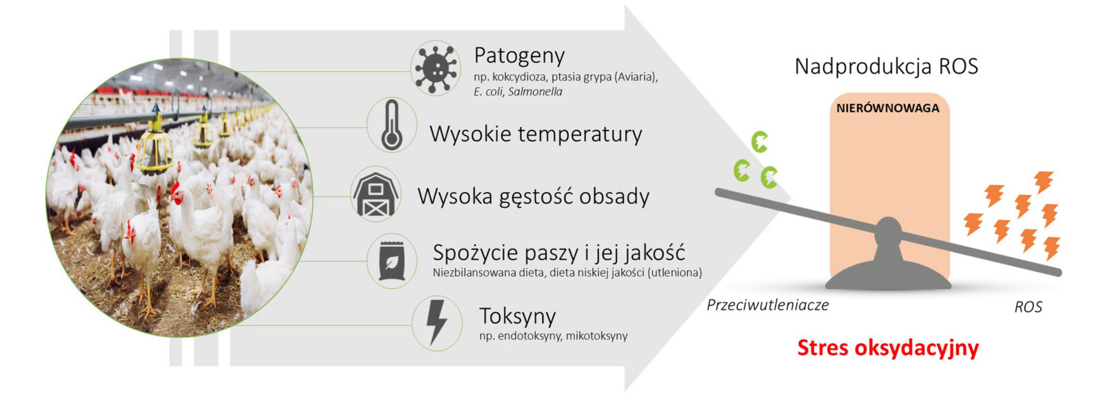 Intensywne systemy produkcji narażają zwierzęta na czynniki stresogenne takie jak upał, patogeny i toksyny, prowadząc do stresu oksydacyjnego – braku równowagi między przeciwutleniaczami a reaktywnymi formami tlenu (ROS).